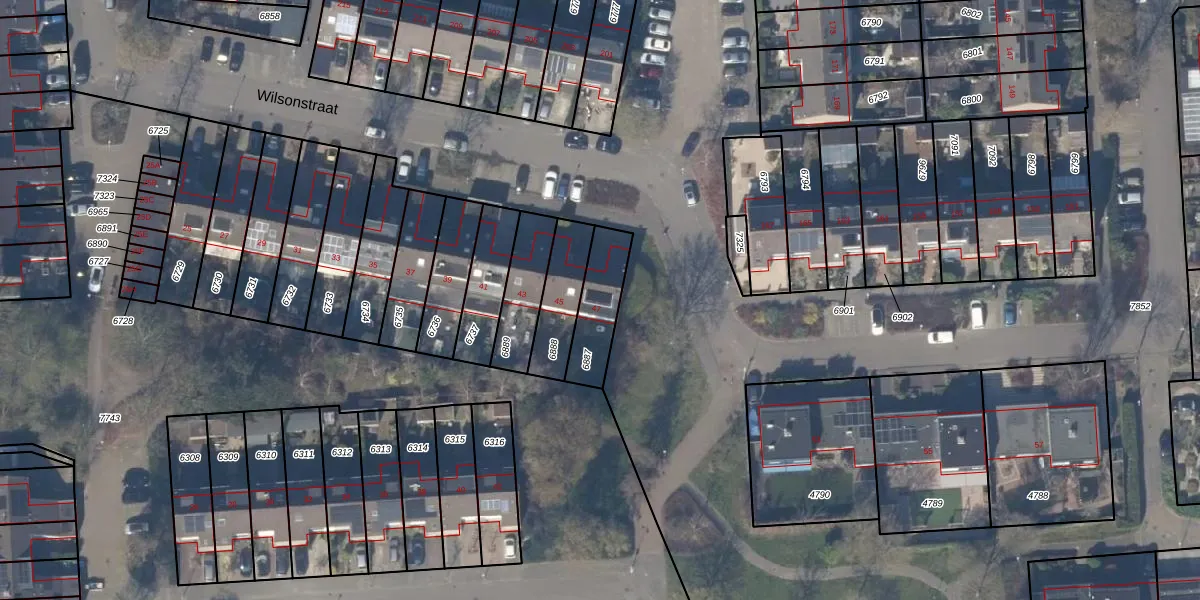 Het perceel waarop Wilsonstraat 47 staat heeft een oppervlakte van 167 m². Dit is een middelgroot perceel. De perceeloppervlakte wordt geregistreerd door het Kadaster. Gedetailleerde informatie over de maten van dit perceel kunt u vinden in het rapport Kadastrale kaart met maatvoering van Wilsonstraat 47.
