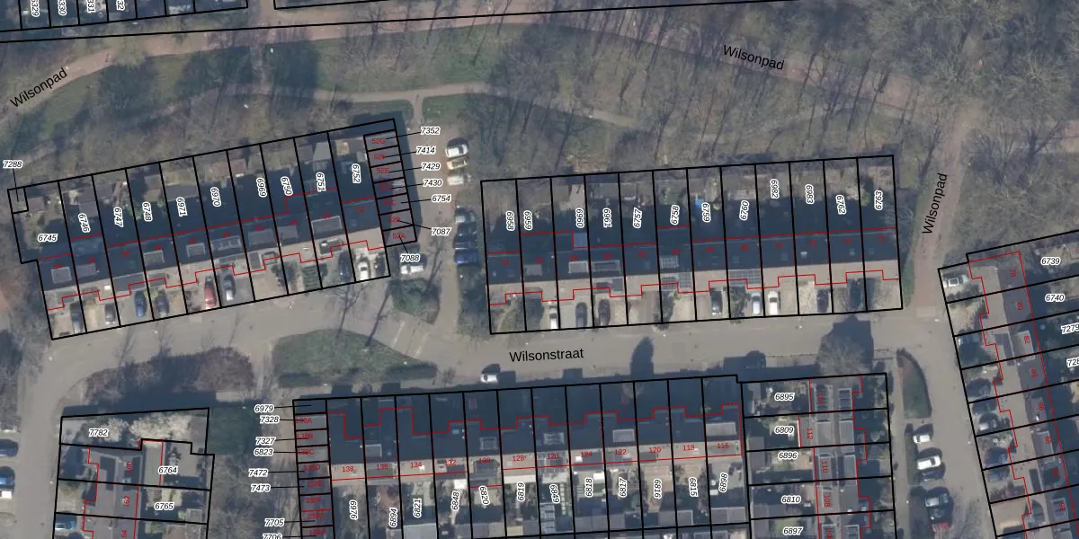 Het perceel waarop Wilsonstraat 56 staat heeft een oppervlakte van 179 m². Dit is een middelgroot perceel. De perceeloppervlakte wordt geregistreerd door het Kadaster. Gedetailleerde informatie over de maten van dit perceel kunt u vinden in het rapport Kadastrale kaart met maatvoering van Wilsonstraat 56.