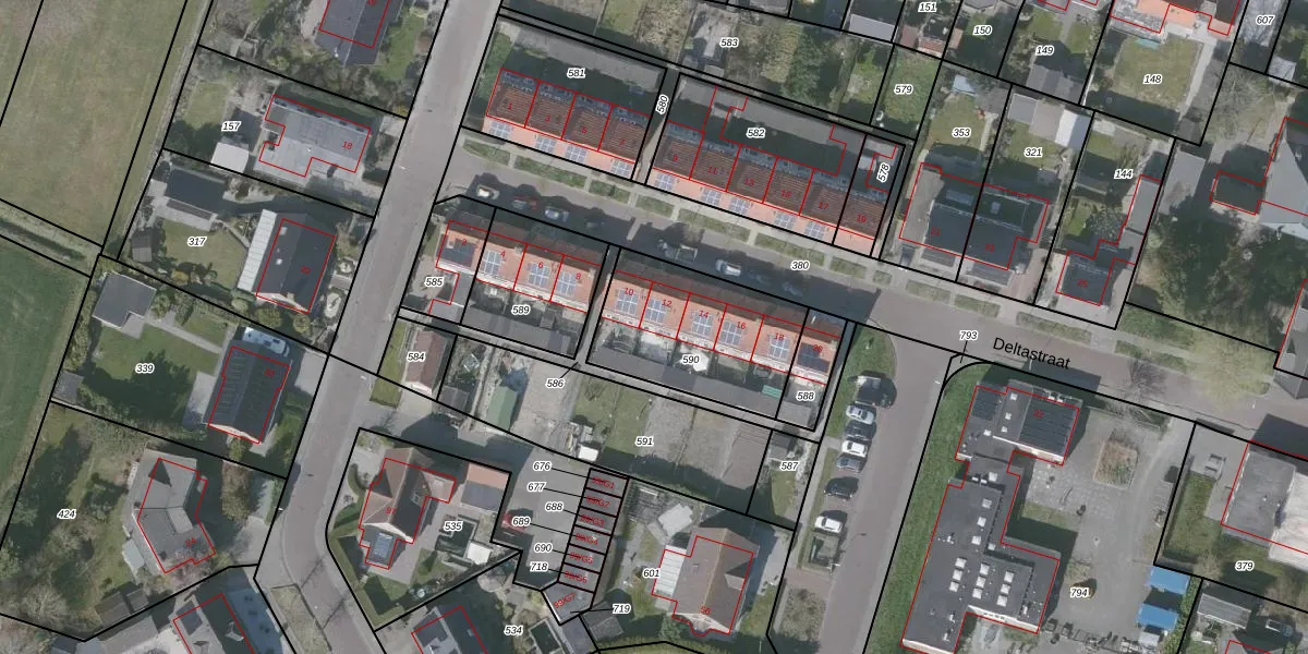 Deltastraat 12 is gelegen op kadastraal perceel OBG00EH590. Deze kadastrale aanduiding is uniek en wordt gebruikt door het Kadaster om eigendomsrechten en andere zakelijke rechten vast te leggen. Het perceel maakt onderdeel uit van de kadastrale gemeente Oostburg.