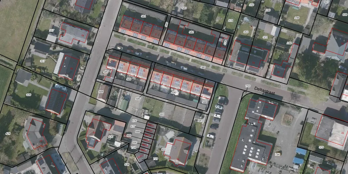 Deltastraat 14 is gelegen op kadastraal perceel OBG00EH590. Deze kadastrale aanduiding is uniek en wordt gebruikt door het Kadaster om eigendomsrechten en andere zakelijke rechten vast te leggen. Het perceel maakt onderdeel uit van de kadastrale gemeente Oostburg.