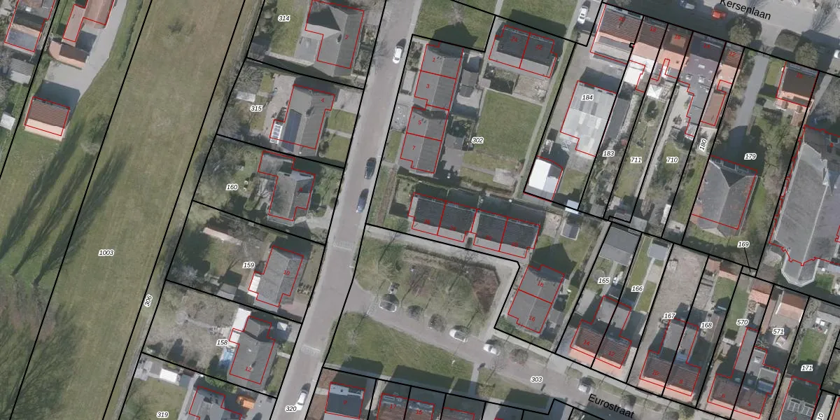 Het perceel waarop Eurostraat 26 staat heeft een oppervlakte van 2430 m². Dit is een zeer groot perceel. De perceeloppervlakte wordt geregistreerd door het Kadaster. Gedetailleerde informatie over de maten van dit perceel kunt u vinden in het rapport Kadastrale kaart met maatvoering van Eurostraat 26.