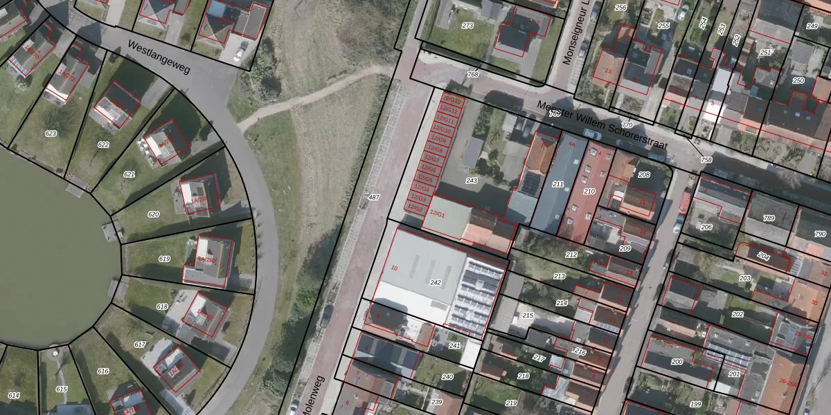 Molenweg 12-G2 is gelegen op kadastraal perceel OBG00EH243. Deze kadastrale aanduiding is uniek en wordt gebruikt door het Kadaster om eigendomsrechten en andere zakelijke rechten vast te leggen. Het perceel maakt onderdeel uit van de kadastrale gemeente Oostburg.