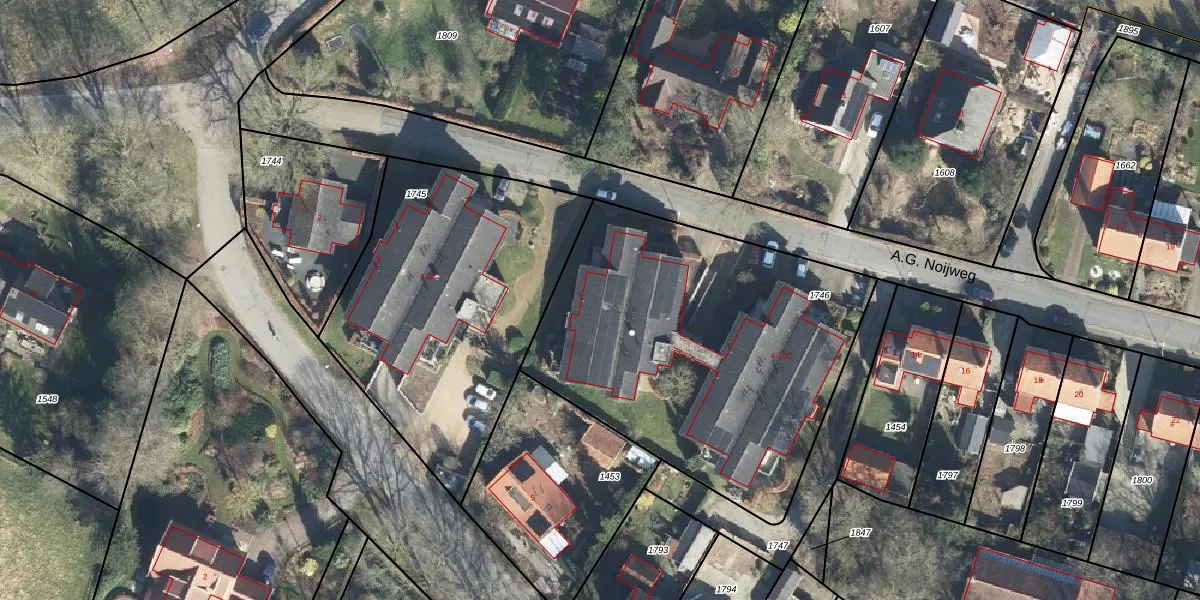 Het perceel waarop A.G. Noijweg 4 staat heeft een oppervlakte van 1890 m². Dit is een zeer groot perceel. De perceeloppervlakte wordt geregistreerd door het Kadaster. Gedetailleerde informatie over de maten van dit perceel kunt u vinden in het rapport Kadastrale kaart met maatvoering van A.G. Noijweg 4.