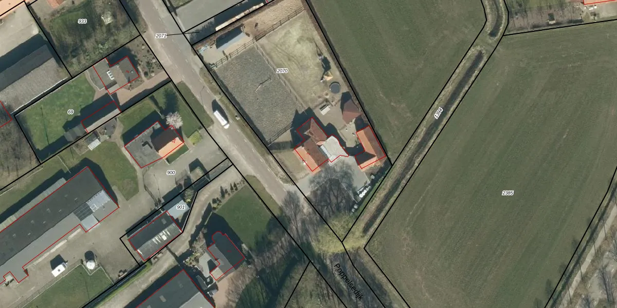 Het perceel waarop Poppelsedijk 2 staat heeft een oppervlakte van 2595 m². Dit is een zeer groot perceel. De perceeloppervlakte wordt geregistreerd door het Kadaster. Gedetailleerde informatie over de maten van dit perceel kunt u vinden in het rapport Kadastrale kaart met maatvoering van Poppelsedijk 2.
