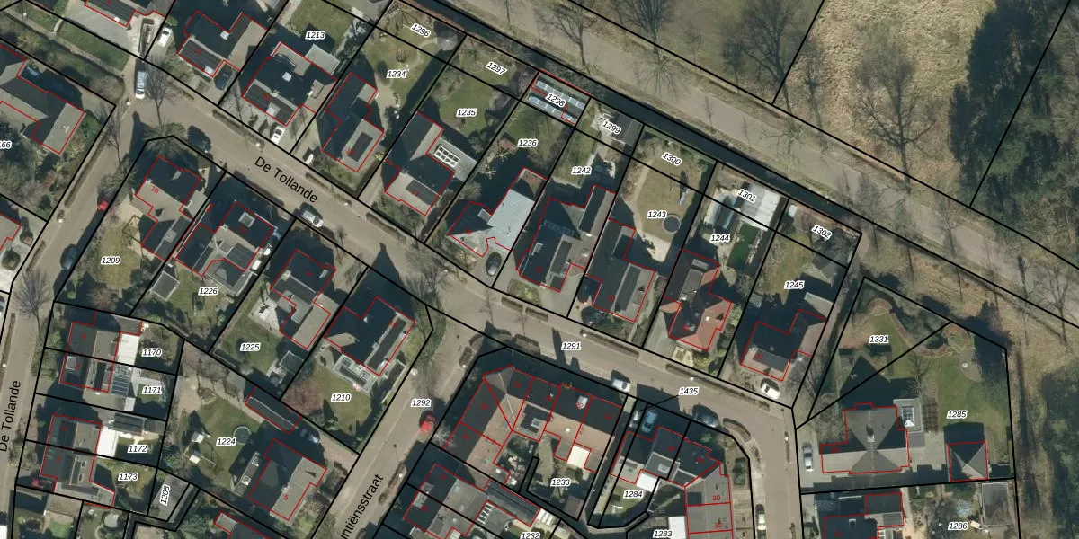 Het perceel waarop De Tollande 21 staat heeft een oppervlakte van 437 m². Dit is een groot perceel. De perceeloppervlakte wordt geregistreerd door het Kadaster. Gedetailleerde informatie over de maten van dit perceel kunt u vinden in het rapport Kadastrale kaart met maatvoering van De Tollande 21.