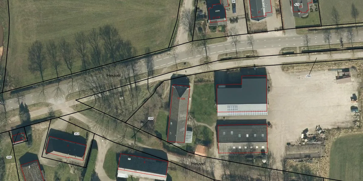 Het perceel waarop Heuvel 12-A staat heeft een oppervlakte van 1,8 ha. Dit is een zeer groot perceel. De perceeloppervlakte wordt geregistreerd door het Kadaster. Gedetailleerde informatie over de maten van dit perceel kunt u vinden in het rapport Kadastrale kaart met maatvoering van Heuvel 12-A.