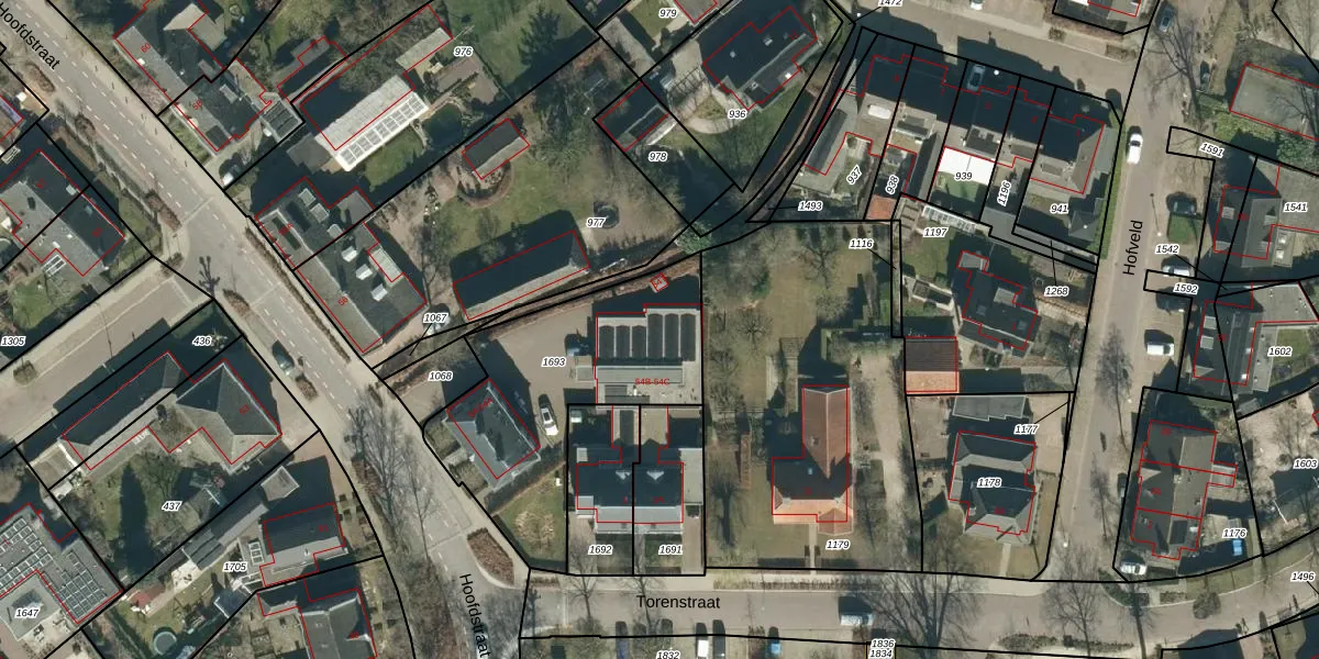 Het perceel waarop Hoofdstraat 54-B staat heeft een oppervlakte van 975 m². Dit is een groot perceel. De perceeloppervlakte wordt geregistreerd door het Kadaster. Gedetailleerde informatie over de maten van dit perceel kunt u vinden in het rapport Kadastrale kaart met maatvoering van Hoofdstraat 54-B.