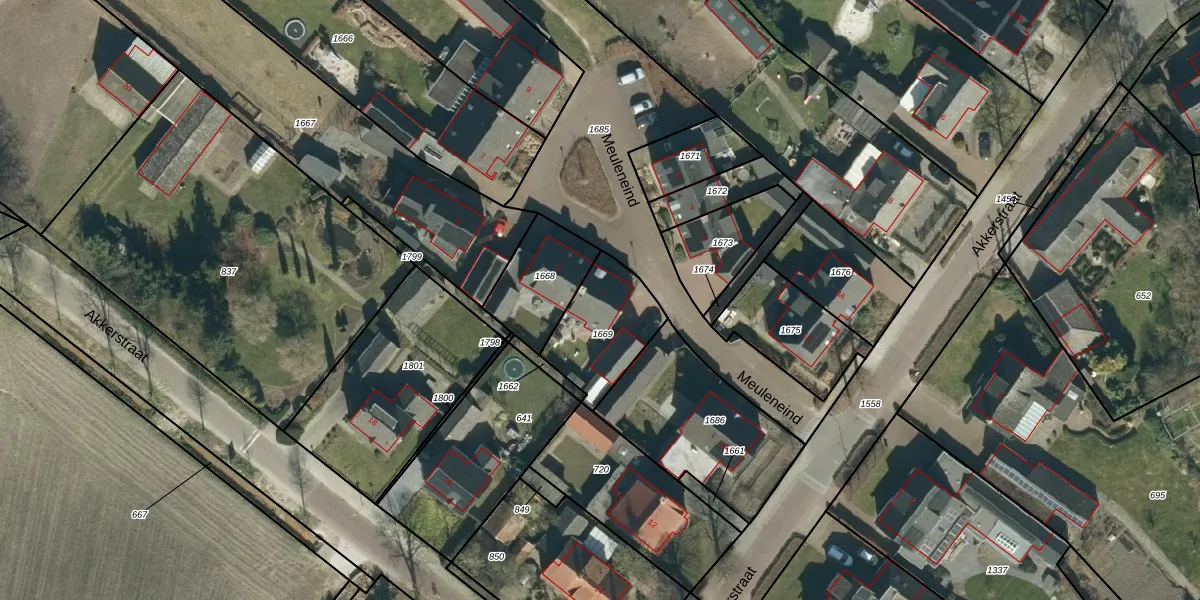 Meuleneind 1 is gelegen op kadastraal perceel HGL04E1669. Deze kadastrale aanduiding is uniek en wordt gebruikt door het Kadaster om eigendomsrechten en andere zakelijke rechten vast te leggen. Het perceel maakt onderdeel uit van de kadastrale gemeente Hoogeloon.
