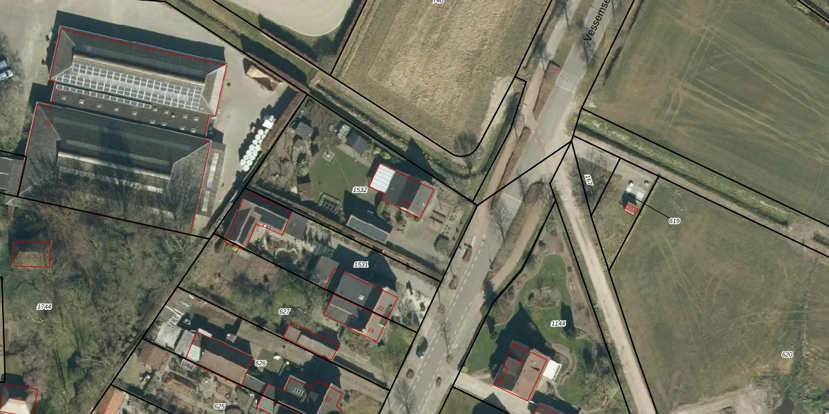Het perceel waarop Vessemseweg 21-A staat heeft een oppervlakte van 1202 m². Dit is een zeer groot perceel. De perceeloppervlakte wordt geregistreerd door het Kadaster. Gedetailleerde informatie over de maten van dit perceel kunt u vinden in het rapport Kadastrale kaart met maatvoering van Vessemseweg 21-A.