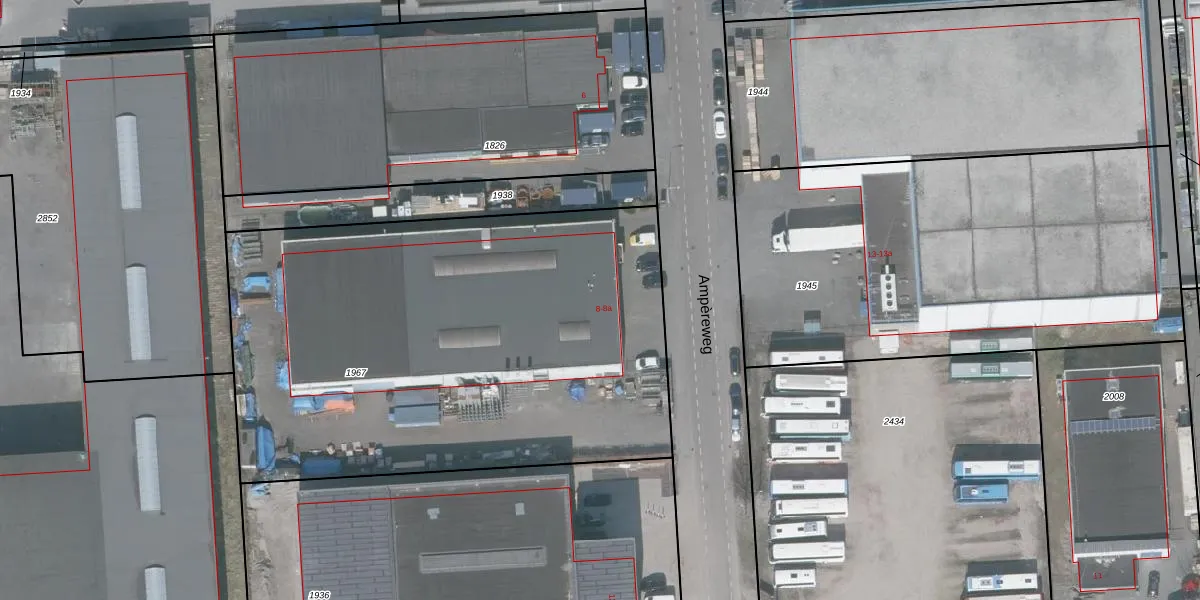 Het perceel waarop Ampèreweg 8 staat heeft een oppervlakte van 3027 m². Dit is een zeer groot perceel. De perceeloppervlakte wordt geregistreerd door het Kadaster. Gedetailleerde informatie over de maten van dit perceel kunt u vinden in het rapport Kadastrale kaart met maatvoering van Ampèreweg 8.