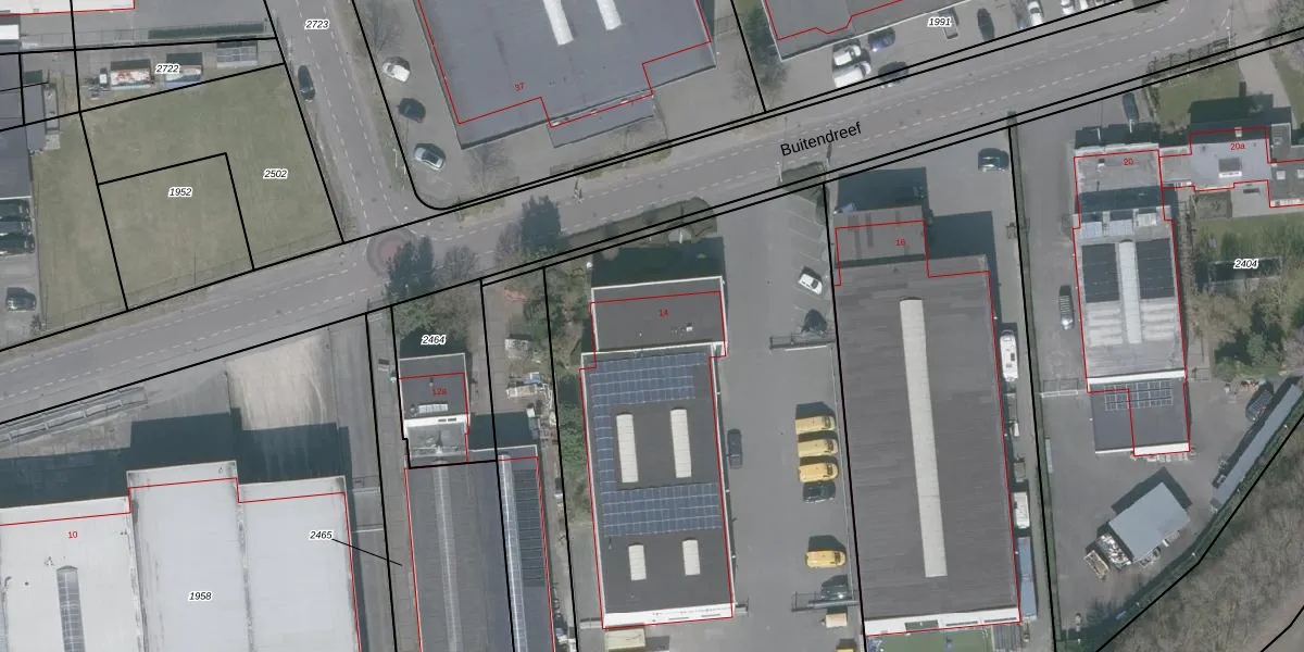 Buitendreef 14 is gelegen op kadastraal perceel WDT00C2496. Deze kadastrale aanduiding is uniek en wordt gebruikt door het Kadaster om eigendomsrechten en andere zakelijke rechten vast te leggen. Het perceel maakt onderdeel uit van de kadastrale gemeente Woensdrecht.