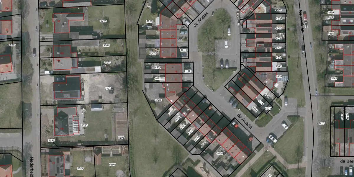 Het perceel waarop de Acacia 16 staat heeft een oppervlakte van 331 m². Dit is een groot perceel. De perceeloppervlakte wordt geregistreerd door het Kadaster. Gedetailleerde informatie over de maten van dit perceel kunt u vinden in het rapport Kadastrale kaart met maatvoering van de Acacia 16.