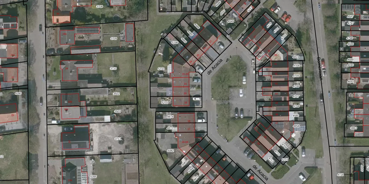 Het perceel waarop de Acacia 20 staat heeft een oppervlakte van 621 m². Dit is een groot perceel. De perceeloppervlakte wordt geregistreerd door het Kadaster. Gedetailleerde informatie over de maten van dit perceel kunt u vinden in het rapport Kadastrale kaart met maatvoering van de Acacia 20.