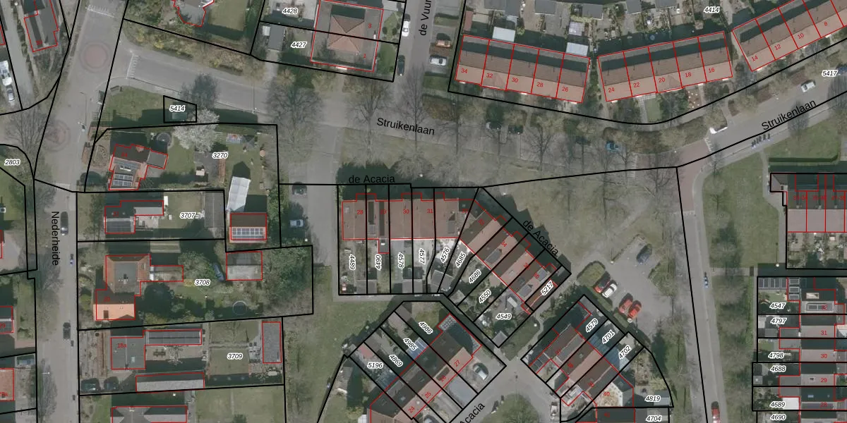 Het perceel waarop de Acacia 31 staat heeft een oppervlakte van 120 m². Dit is een middelgroot perceel. De perceeloppervlakte wordt geregistreerd door het Kadaster. Gedetailleerde informatie over de maten van dit perceel kunt u vinden in het rapport Kadastrale kaart met maatvoering van de Acacia 31.