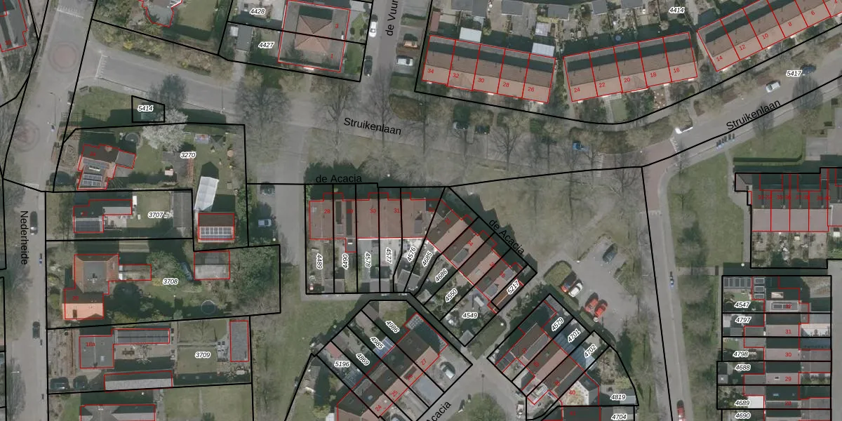 Het perceel waarop de Acacia 32 staat heeft een oppervlakte van 148 m². Dit is een middelgroot perceel. De perceeloppervlakte wordt geregistreerd door het Kadaster. Gedetailleerde informatie over de maten van dit perceel kunt u vinden in het rapport Kadastrale kaart met maatvoering van de Acacia 32.