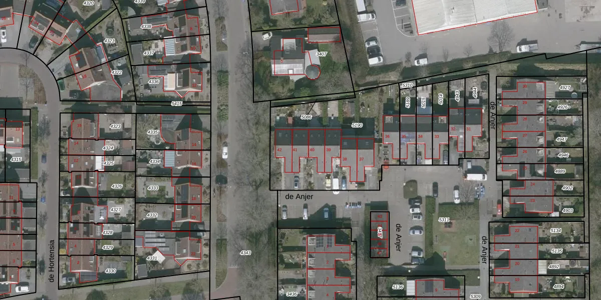 Het perceel waarop de Anjer 41 staat heeft een oppervlakte van 1284 m². Dit is een zeer groot perceel. De perceeloppervlakte wordt geregistreerd door het Kadaster. Gedetailleerde informatie over de maten van dit perceel kunt u vinden in het rapport Kadastrale kaart met maatvoering van de Anjer 41.