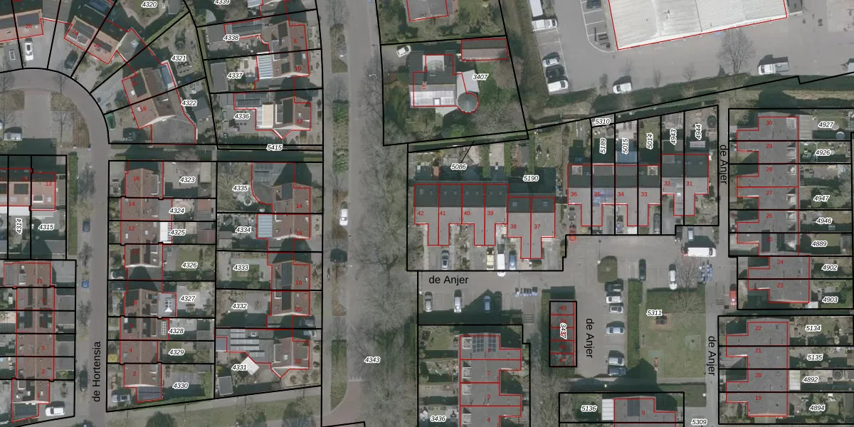 Het perceel waarop de Anjer 42 staat heeft een oppervlakte van 1284 m². Dit is een zeer groot perceel. De perceeloppervlakte wordt geregistreerd door het Kadaster. Gedetailleerde informatie over de maten van dit perceel kunt u vinden in het rapport Kadastrale kaart met maatvoering van de Anjer 42.