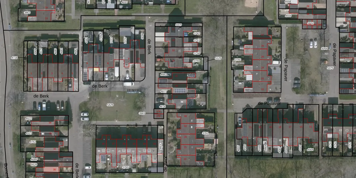 Het perceel waarop de Berk 16 staat heeft een oppervlakte van 166 m². Dit is een middelgroot perceel. De perceeloppervlakte wordt geregistreerd door het Kadaster. Gedetailleerde informatie over de maten van dit perceel kunt u vinden in het rapport Kadastrale kaart met maatvoering van de Berk 16.