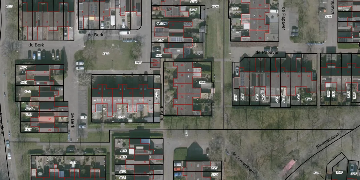 Het perceel waarop de Berk 20 staat heeft een oppervlakte van 812 m². Dit is een groot perceel. De perceeloppervlakte wordt geregistreerd door het Kadaster. Gedetailleerde informatie over de maten van dit perceel kunt u vinden in het rapport Kadastrale kaart met maatvoering van de Berk 20.