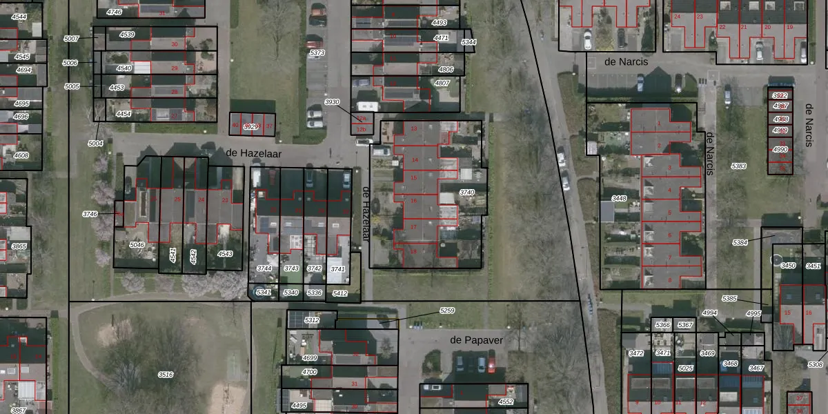 Het perceel waarop de Hazelaar 16 staat heeft een oppervlakte van 956 m². Dit is een groot perceel. De perceeloppervlakte wordt geregistreerd door het Kadaster. Gedetailleerde informatie over de maten van dit perceel kunt u vinden in het rapport Kadastrale kaart met maatvoering van de Hazelaar 16.