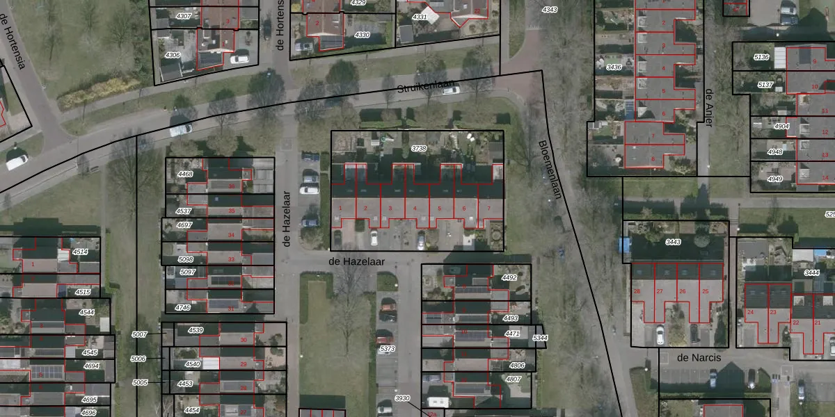 Het perceel waarop de Hazelaar 4 staat heeft een oppervlakte van 1202 m². Dit is een zeer groot perceel. De perceeloppervlakte wordt geregistreerd door het Kadaster. Gedetailleerde informatie over de maten van dit perceel kunt u vinden in het rapport Kadastrale kaart met maatvoering van de Hazelaar 4.