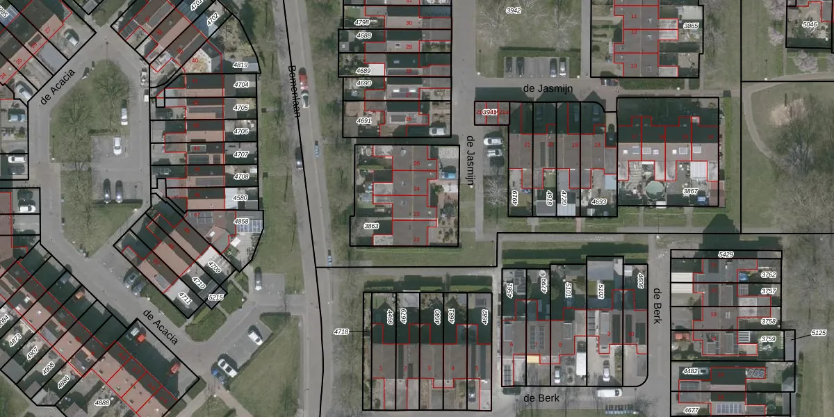 Het perceel waarop de Jasmijn 23 staat heeft een oppervlakte van 612 m². Dit is een groot perceel. De perceeloppervlakte wordt geregistreerd door het Kadaster. Gedetailleerde informatie over de maten van dit perceel kunt u vinden in het rapport Kadastrale kaart met maatvoering van de Jasmijn 23.