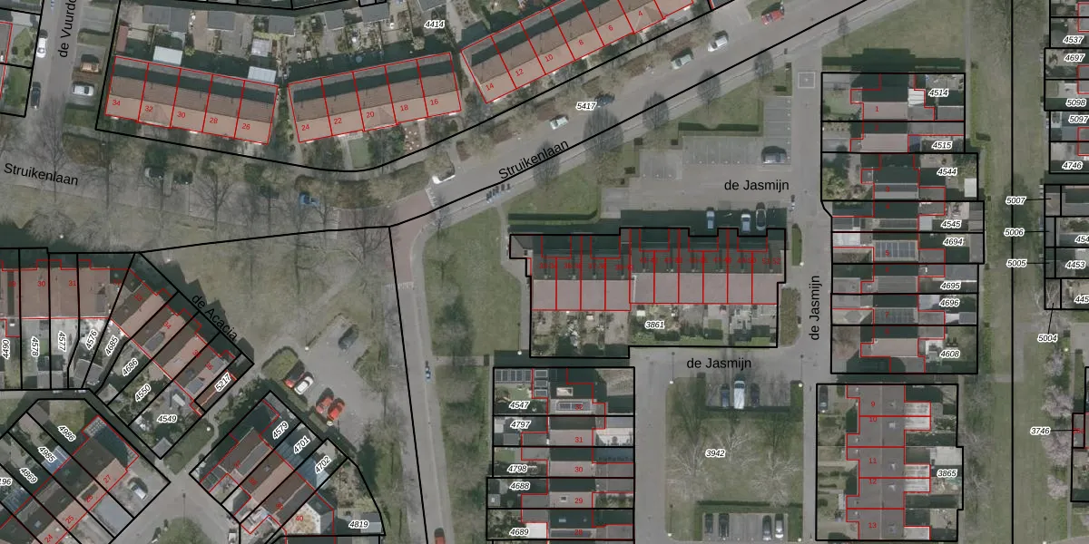 Het perceel waarop de Jasmijn 33 staat heeft een oppervlakte van 1015 m². Dit is een zeer groot perceel. De perceeloppervlakte wordt geregistreerd door het Kadaster. Gedetailleerde informatie over de maten van dit perceel kunt u vinden in het rapport Kadastrale kaart met maatvoering van de Jasmijn 33.