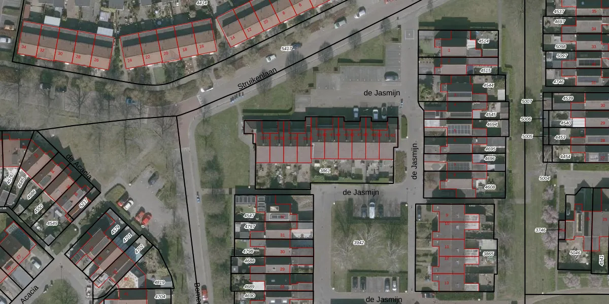 Het perceel waarop de Jasmijn 40 staat heeft een oppervlakte van 1015 m². Dit is een zeer groot perceel. De perceeloppervlakte wordt geregistreerd door het Kadaster. Gedetailleerde informatie over de maten van dit perceel kunt u vinden in het rapport Kadastrale kaart met maatvoering van de Jasmijn 40.