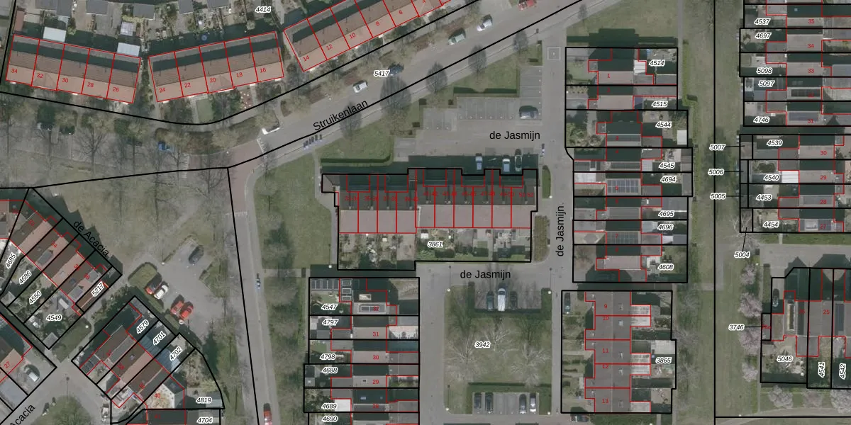Het perceel waarop de Jasmijn 42 staat heeft een oppervlakte van 1015 m². Dit is een zeer groot perceel. De perceeloppervlakte wordt geregistreerd door het Kadaster. Gedetailleerde informatie over de maten van dit perceel kunt u vinden in het rapport Kadastrale kaart met maatvoering van de Jasmijn 42.
