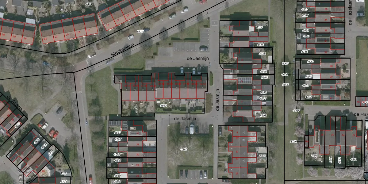 Het perceel waarop de Jasmijn 48 staat heeft een oppervlakte van 1015 m². Dit is een zeer groot perceel. De perceeloppervlakte wordt geregistreerd door het Kadaster. Gedetailleerde informatie over de maten van dit perceel kunt u vinden in het rapport Kadastrale kaart met maatvoering van de Jasmijn 48.