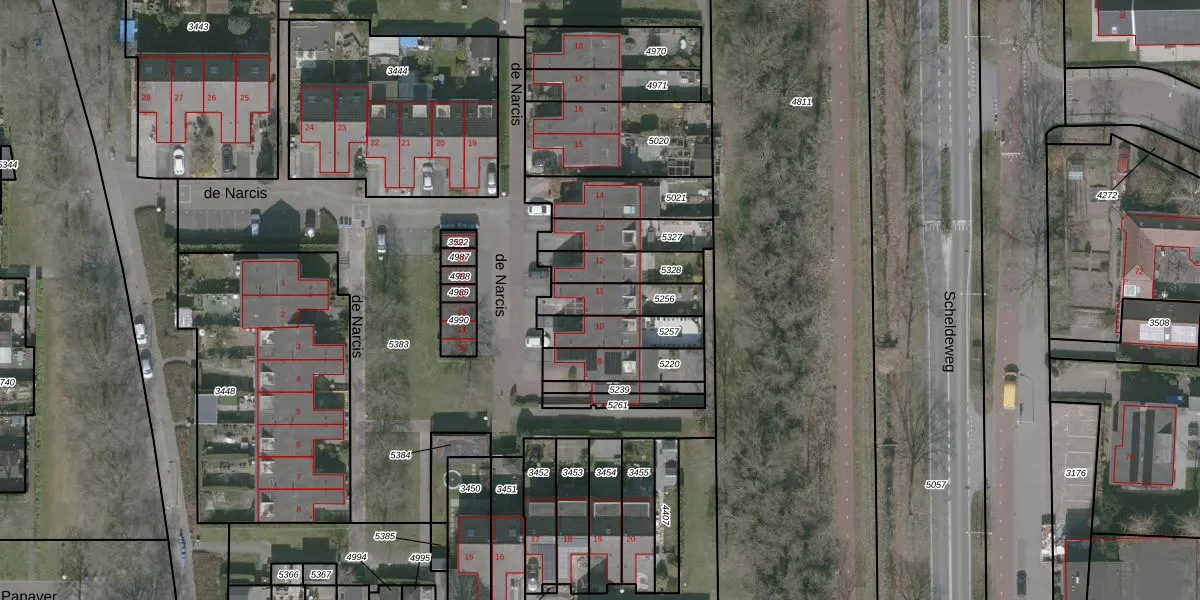 de Narcis 11 is gelegen op kadastraal perceel WDT00G5256. Deze kadastrale aanduiding is uniek en wordt gebruikt door het Kadaster om eigendomsrechten en andere zakelijke rechten vast te leggen. Het perceel maakt onderdeel uit van de kadastrale gemeente Woensdrecht.