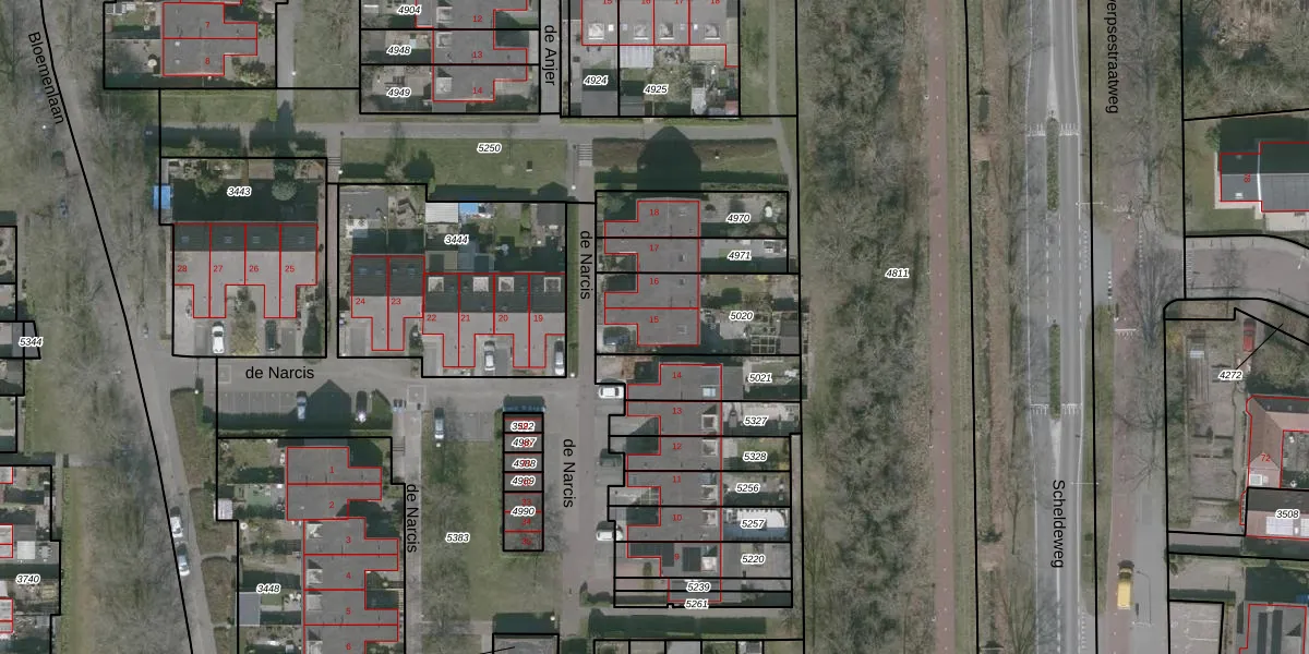 de Narcis 15 is gelegen op kadastraal perceel WDT00G5020. Deze kadastrale aanduiding is uniek en wordt gebruikt door het Kadaster om eigendomsrechten en andere zakelijke rechten vast te leggen. Het perceel maakt onderdeel uit van de kadastrale gemeente Woensdrecht.