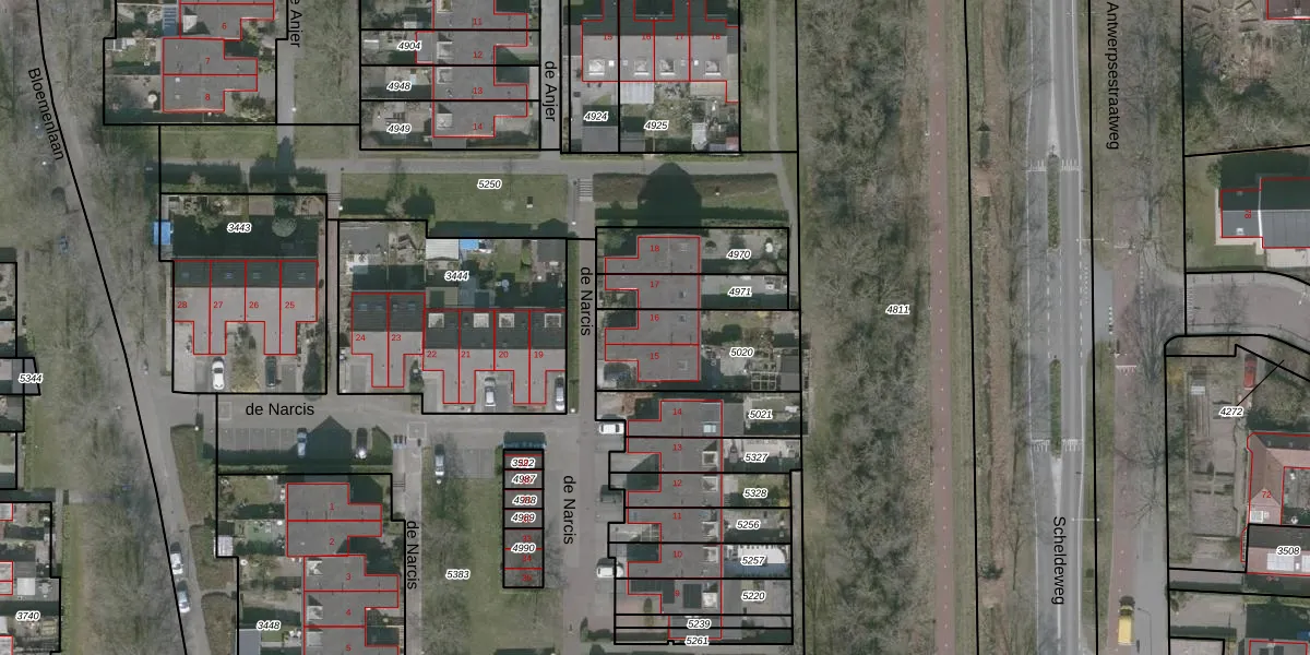 de Narcis 16 is gelegen op kadastraal perceel WDT00G5020. Deze kadastrale aanduiding is uniek en wordt gebruikt door het Kadaster om eigendomsrechten en andere zakelijke rechten vast te leggen. Het perceel maakt onderdeel uit van de kadastrale gemeente Woensdrecht.