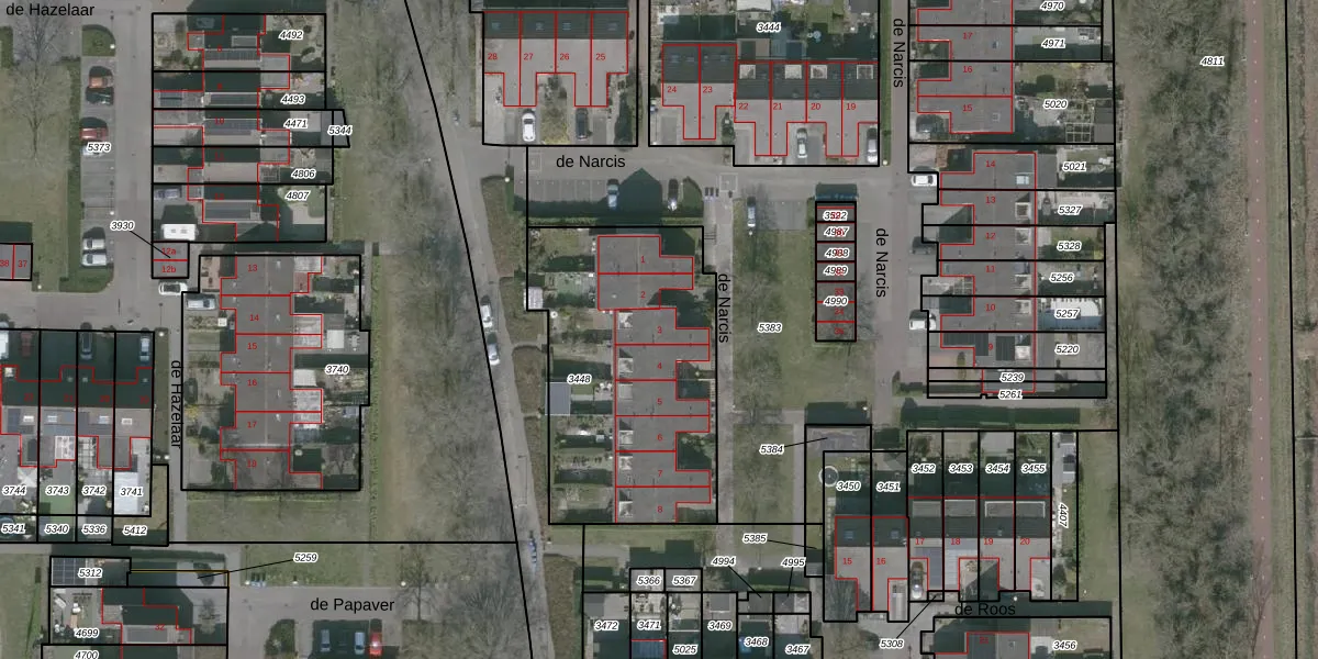 Het perceel waarop de Narcis 3 staat heeft een oppervlakte van 1167 m². Dit is een zeer groot perceel. De perceeloppervlakte wordt geregistreerd door het Kadaster. Gedetailleerde informatie over de maten van dit perceel kunt u vinden in het rapport Kadastrale kaart met maatvoering van de Narcis 3.