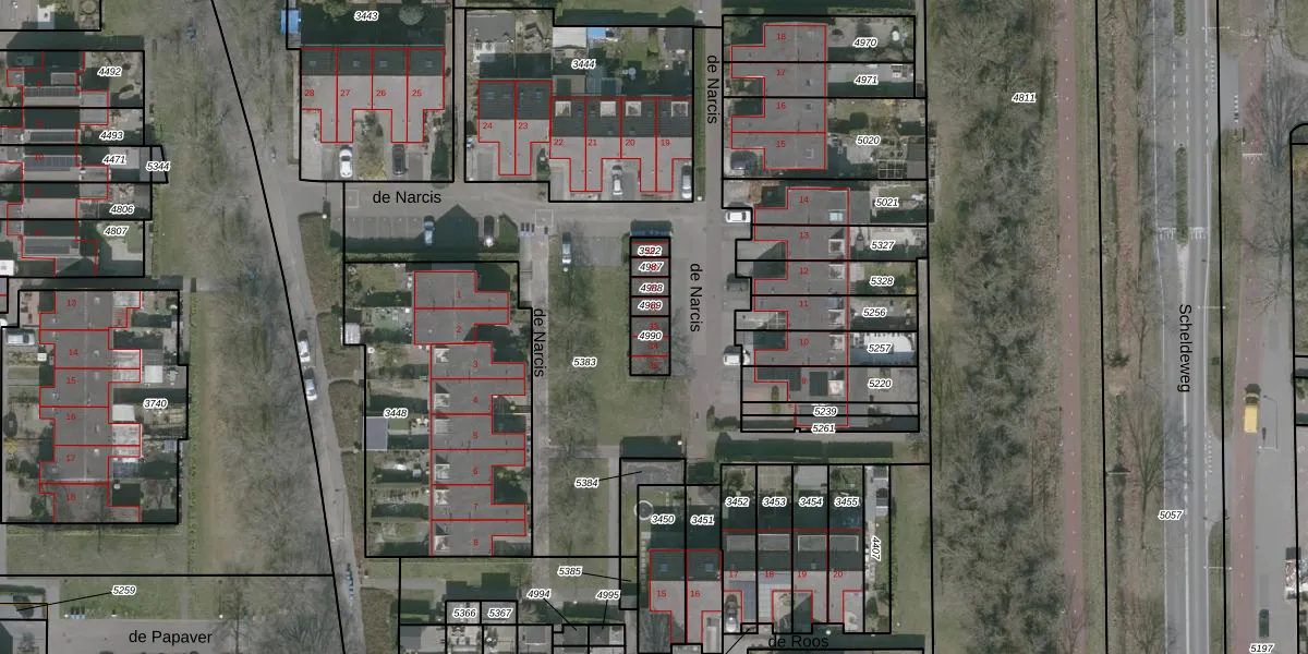 Het perceel waarop de Narcis 33 staat heeft een oppervlakte van 55 m². Dit is een klein perceel. De perceeloppervlakte wordt geregistreerd door het Kadaster. Gedetailleerde informatie over de maten van dit perceel kunt u vinden in het rapport Kadastrale kaart met maatvoering van de Narcis 33.
