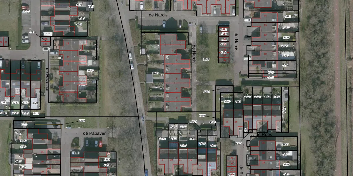 Het perceel waarop de Narcis 6 staat heeft een oppervlakte van 1167 m². Dit is een zeer groot perceel. De perceeloppervlakte wordt geregistreerd door het Kadaster. Gedetailleerde informatie over de maten van dit perceel kunt u vinden in het rapport Kadastrale kaart met maatvoering van de Narcis 6.