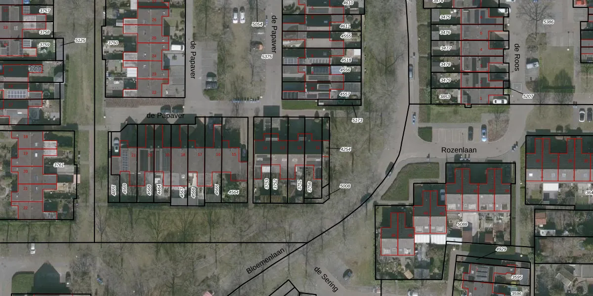 Het perceel waarop de Papaver 12 staat heeft een oppervlakte van 165 m². Dit is een middelgroot perceel. De perceeloppervlakte wordt geregistreerd door het Kadaster. Gedetailleerde informatie over de maten van dit perceel kunt u vinden in het rapport Kadastrale kaart met maatvoering van de Papaver 12.
