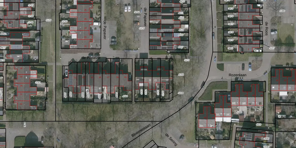 Het perceel waarop de Papaver 13 staat heeft een oppervlakte van 165 m². Dit is een middelgroot perceel. De perceeloppervlakte wordt geregistreerd door het Kadaster. Gedetailleerde informatie over de maten van dit perceel kunt u vinden in het rapport Kadastrale kaart met maatvoering van de Papaver 13.