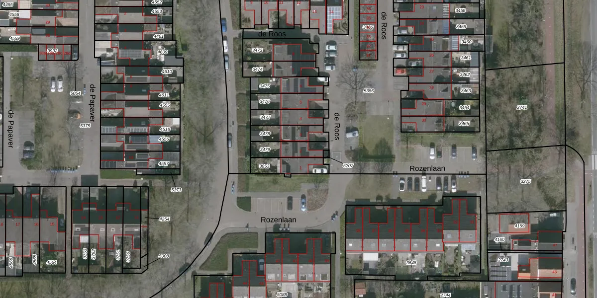 Het perceel waarop de Roos 2 staat heeft een oppervlakte van 136 m². Dit is een middelgroot perceel. De perceeloppervlakte wordt geregistreerd door het Kadaster. Gedetailleerde informatie over de maten van dit perceel kunt u vinden in het rapport Kadastrale kaart met maatvoering van de Roos 2.