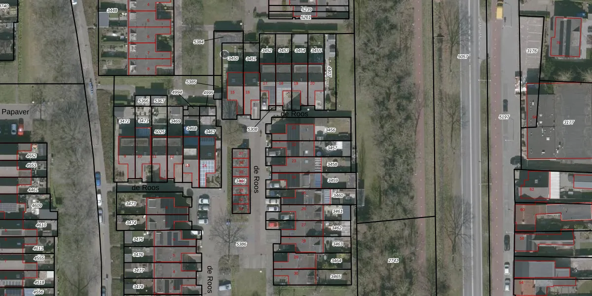 Het perceel waarop de Roos 22 staat heeft een oppervlakte van 150 m². Dit is een middelgroot perceel. De perceeloppervlakte wordt geregistreerd door het Kadaster. Gedetailleerde informatie over de maten van dit perceel kunt u vinden in het rapport Kadastrale kaart met maatvoering van de Roos 22.