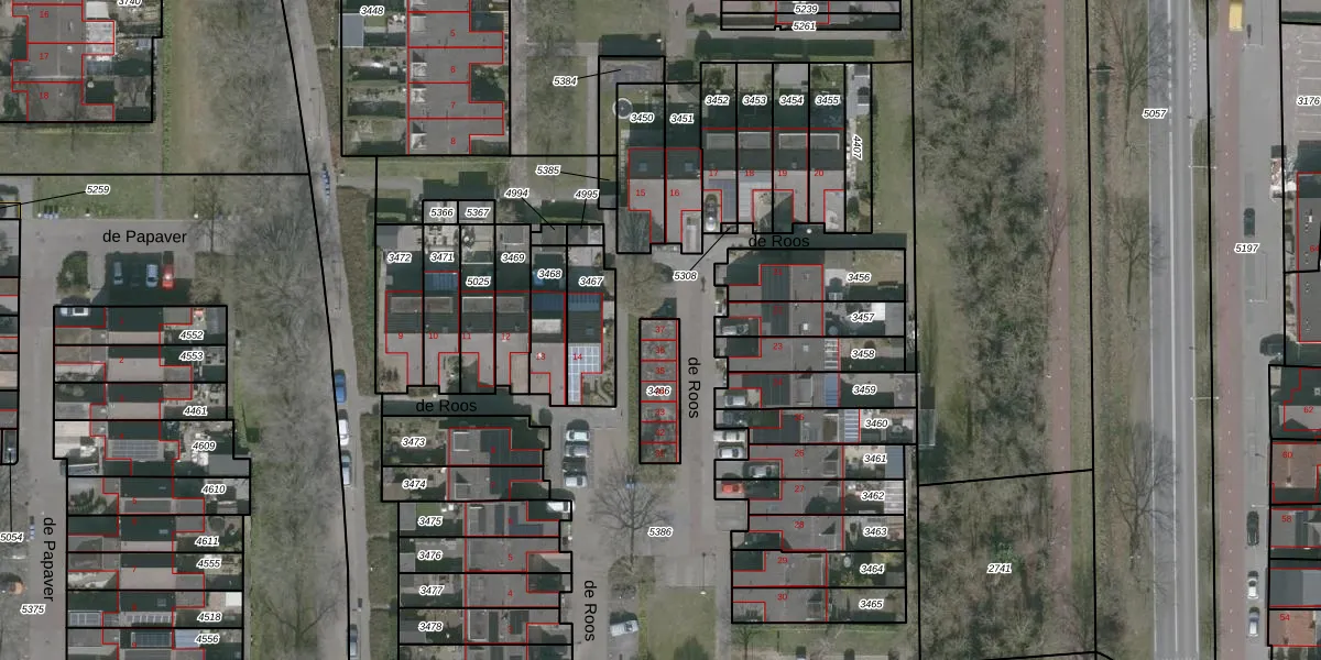 Het perceel waarop de Roos 37 staat heeft een oppervlakte van 131 m². Dit is een middelgroot perceel. De perceeloppervlakte wordt geregistreerd door het Kadaster. Gedetailleerde informatie over de maten van dit perceel kunt u vinden in het rapport Kadastrale kaart met maatvoering van de Roos 37.