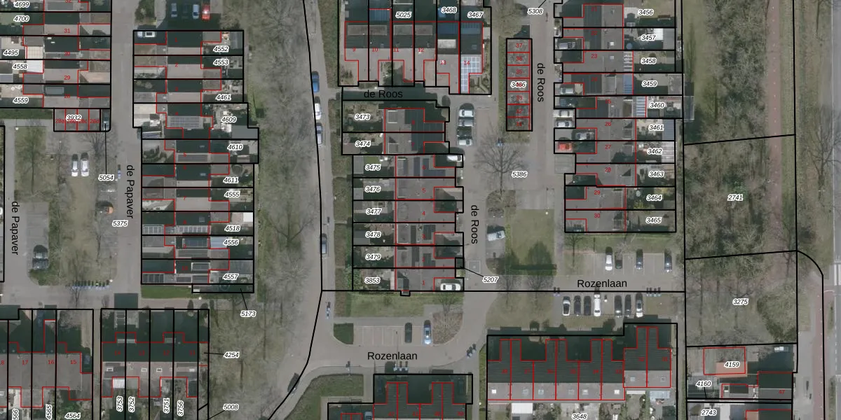 Het perceel waarop de Roos 4 staat heeft een oppervlakte van 136 m². Dit is een middelgroot perceel. De perceeloppervlakte wordt geregistreerd door het Kadaster. Gedetailleerde informatie over de maten van dit perceel kunt u vinden in het rapport Kadastrale kaart met maatvoering van de Roos 4.