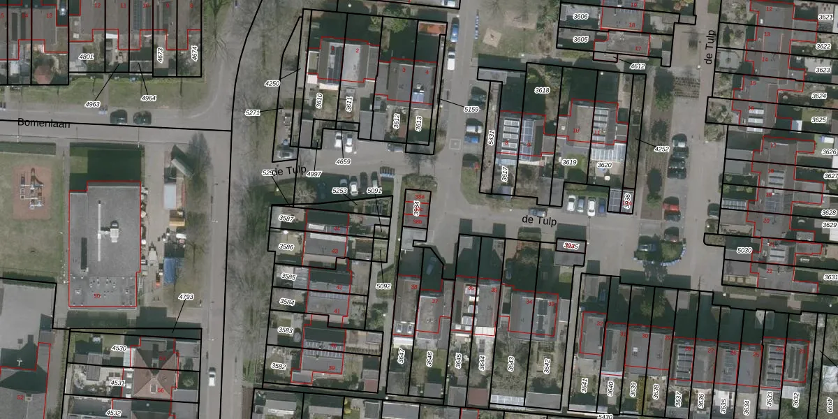 Het perceel waarop de Tulp 38-c staat heeft een oppervlakte van 54 m². Dit is een klein perceel. De perceeloppervlakte wordt geregistreerd door het Kadaster. Gedetailleerde informatie over de maten van dit perceel kunt u vinden in het rapport Kadastrale kaart met maatvoering van de Tulp 38-c.