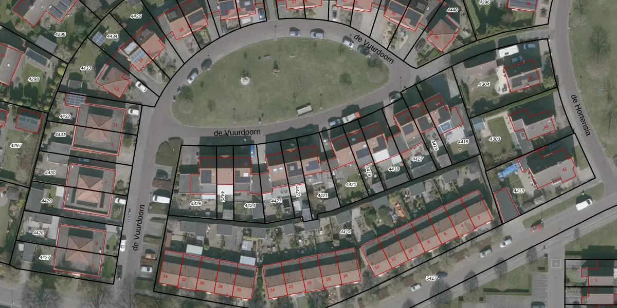 Het perceel waarop de Vuurdoorn 12 staat heeft een oppervlakte van 227 m². Dit is een middelgroot perceel. De perceeloppervlakte wordt geregistreerd door het Kadaster. Gedetailleerde informatie over de maten van dit perceel kunt u vinden in het rapport Kadastrale kaart met maatvoering van de Vuurdoorn 12.