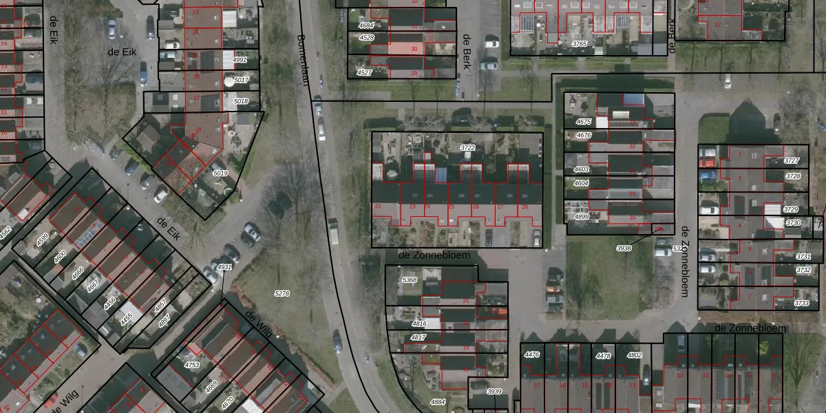 Het perceel waarop de Zonnebloem 23 staat heeft een oppervlakte van 1168 m². Dit is een zeer groot perceel. De perceeloppervlakte wordt geregistreerd door het Kadaster. Gedetailleerde informatie over de maten van dit perceel kunt u vinden in het rapport Kadastrale kaart met maatvoering van de Zonnebloem 23.