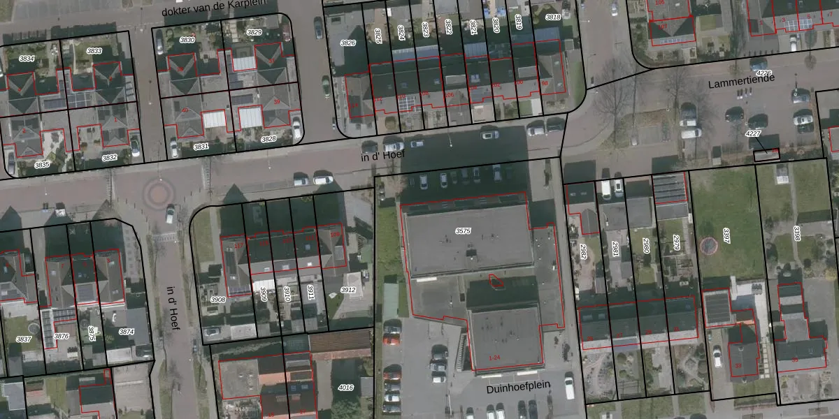 Het perceel waarop Duinhoefplein 23 staat heeft een oppervlakte van 3095 m². Dit is een zeer groot perceel. De perceeloppervlakte wordt geregistreerd door het Kadaster. Gedetailleerde informatie over de maten van dit perceel kunt u vinden in het rapport Kadastrale kaart met maatvoering van Duinhoefplein 23.