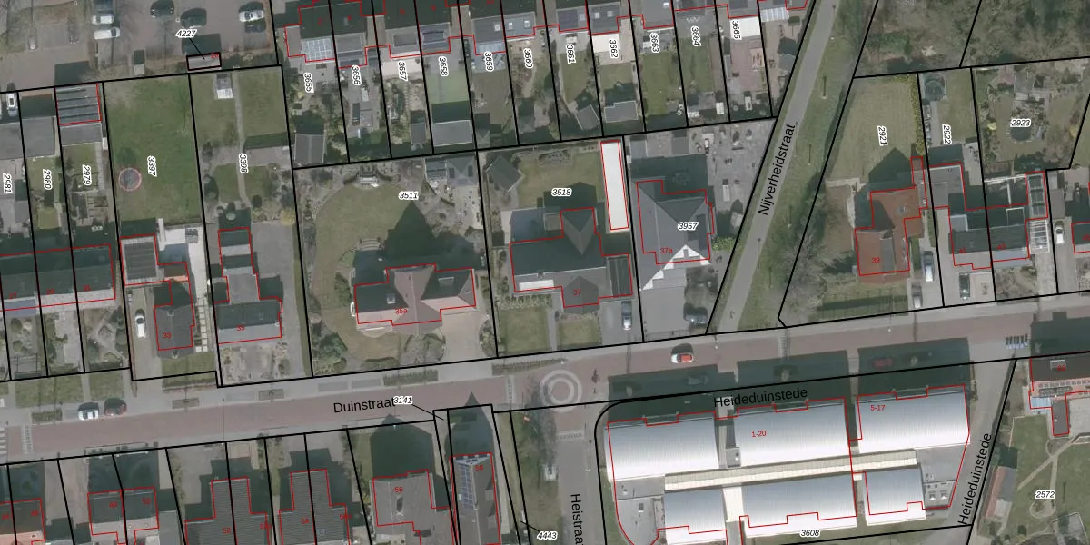 Het perceel waarop Duinstraat 37 staat heeft een oppervlakte van 1030 m². Dit is een zeer groot perceel. De perceeloppervlakte wordt geregistreerd door het Kadaster. Gedetailleerde informatie over de maten van dit perceel kunt u vinden in het rapport Kadastrale kaart met maatvoering van Duinstraat 37.