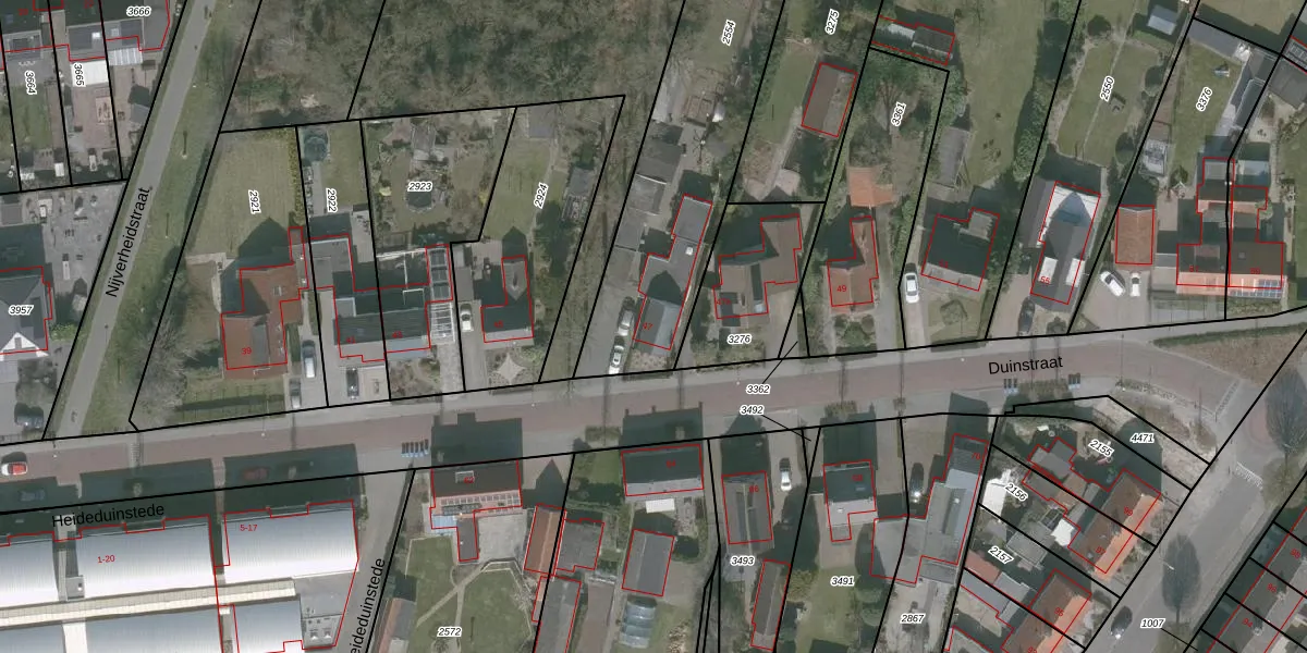 Het perceel waarop Duinstraat 47 staat heeft een oppervlakte van 1341 m². Dit is een zeer groot perceel. De perceeloppervlakte wordt geregistreerd door het Kadaster. Gedetailleerde informatie over de maten van dit perceel kunt u vinden in het rapport Kadastrale kaart met maatvoering van Duinstraat 47.