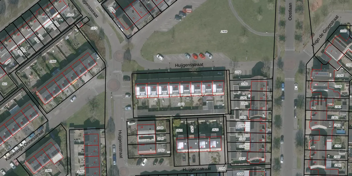 Het perceel waarop Huijgensstraat 29 staat heeft een oppervlakte van 1346 m². Dit is een zeer groot perceel. De perceeloppervlakte wordt geregistreerd door het Kadaster. Gedetailleerde informatie over de maten van dit perceel kunt u vinden in het rapport Kadastrale kaart met maatvoering van Huijgensstraat 29.