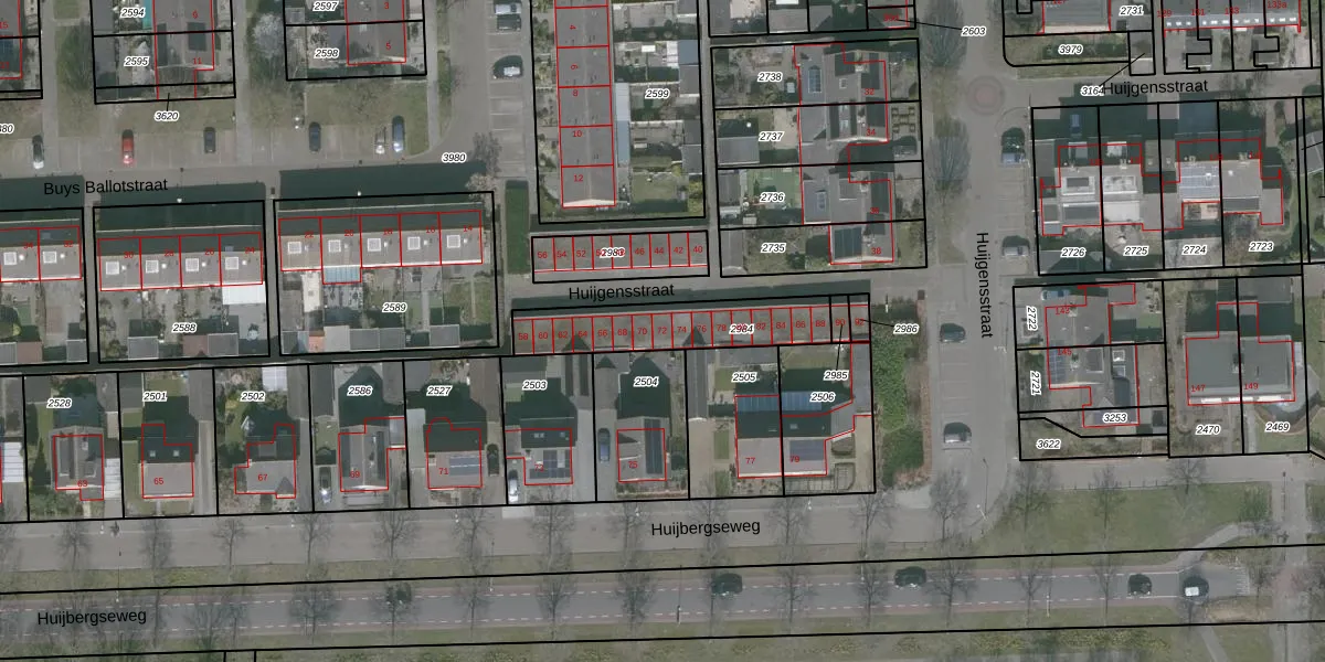 Het perceel waarop Huijgensstraat 72 staat heeft een oppervlakte van 336 m². Dit is een groot perceel. De perceeloppervlakte wordt geregistreerd door het Kadaster. Gedetailleerde informatie over de maten van dit perceel kunt u vinden in het rapport Kadastrale kaart met maatvoering van Huijgensstraat 72.